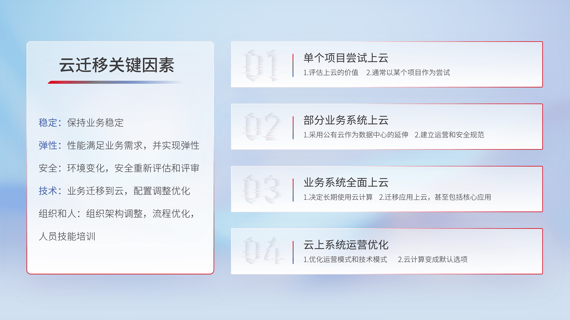 结合实际业务,,,从规划设计、、、云平台选型、、云原生改造、、数据迁移、、集成交付,,,迁移全过程为客户识别最佳上云路径,,,,做好风险识别管理,,,,设计网络架构、、、身份权限、、、、安全审计合规、、、、操作审计、、、日志审计、、、、监控告警策略、、、、多站点容灾设计等,,,,对云上基础设施进行整体规划,,,,提升IT治理水平,,以满足弹性、、、、高可用、、、、高性能的需求。。。
