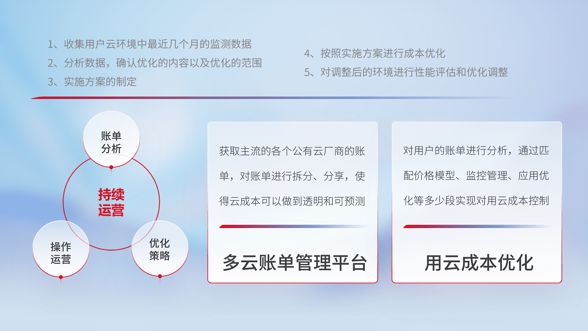通过多云纳管,,,,以统一的资源数据模型把客户的云资源进行抽象和封装,,,,进而实现对多云资源的统一操作,,保障云资源管理的可靠性、、、、稳定性与可用性。。。量身定制化运维内容,,,配置、、、、开发运维、、、补丁管理、、、备份、、监控、、、、认证和访问管理、、、、审计和日常巡检等,,,保障在用云过程中的可靠度,,稳定度以及高可用率。。。。